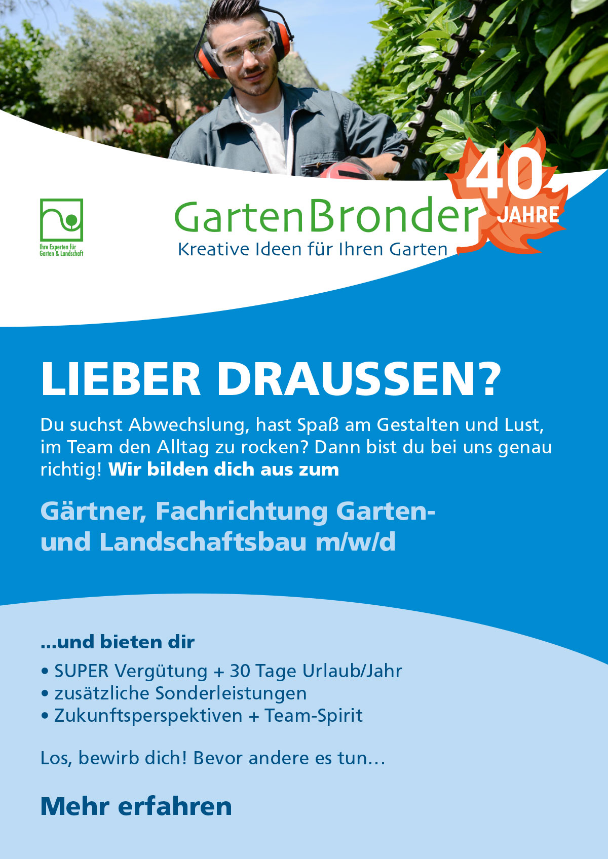 Seit über 4 Jahrzehnten sind wir im kreativen Garten- und Landschaftsbau tätig. Von der Planung, Gestaltung und Ausführung außergewöhnlicher Ideen übernimmt Garten Bronder auch die Pflege der Gärten sowie sämtliche Gartenarbeiten für regionale Kunden. Die Realisation unterschiedlichster Terrassen, Teiche, Wasserspiele oder Wege u. v. m. zählen ebenfalls zum Leistungsspektrum von Garten Bronder.